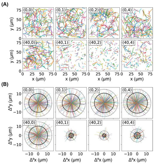 We first examined the effects of Ag+ ions on the motility of E. coli bacteria using swimming assays [32,33,34] as described in the “Materials and Methods” section (Section 3). We observed that, compared to the untreated bacteria (i.e., 0 h), bacteria treated with Ag+ ions at 40 µM for 1, 2, and 4 h were much slower (Movies S1 and S2). From the movies of the freely swimming bacteria, the trajectories of individual bacteria were obtained. A total of 200 randomly chosen examples of trajectories for each experimental condition are shown in Figure 1A, where longer traveling distances were observed for the untreated bacteria compared to the ones treated with Ag+ ions. To see this difference more clearly, we plotted the corresponding rose graphs [35], in which the displacements of the bacteria from their individual initial positions were drawn, . A total of 300 randomly chosen examples were shown in Figure 1B, where the first 12 frames of the trajectories were shown to eliminate the differences due to different lengths of trajectories [35]. Note that a length of 12 was the minimum number of frames of trajectories to be included in the analysis, while many trajectories were much longer (~70 frames). It is obvious that the motility of bacteria decreased significantly after the treatment with Ag+ ions. We quantified the mean and 90th percentile of the displacements of the first 12 frames of all the trajectories in each condition, shown as solid and dotted circles in the rose graphs (Figure 1B), respectively. We found that the two circles for untreated bacteria did not change significantly from 0 to 4 h, indicating that the motility of the bacteria remained similar. In contrast, the treated bacteria showed much smaller radii for both the mean () and 90th percentile circles, indicating that Ag+ treatment led to lower bacterial motility. We also noted that the radii slightly increased with a longer treatment time, implying possible recovery of the bacteria as reported by previous results [6,15].