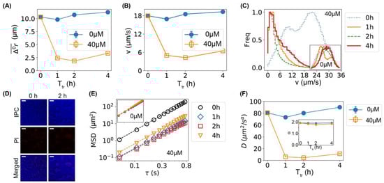 As the bacterial velocities were reduced to 0 (peaked at 2 µm/s) after Ag+ treatment, one possibility is that the bacteria were killed by Ag+ ions at 40 µM. However, the chance of this possibility was low for the following reasons. First, our previous work showed that the majority of bacteria treated with 60 µM Ag+ ions were alive, fighting against damages caused by Ag+ ions and showing oscillations in their cell lengths within 12 h [15]. Second, the cell-viability assay based on propidium iodide staining [36] showed that the number of dead cells (red cells) was low and the majority of treated bacteria were alive at 40 µM Ag+ ions (Figure 2D). Third, if the bacteria were killed, they would display random diffusion (Brownian motion), and the corresponding mean-square displacement (MSD) would be proportional to the diffusion coefficient () and the lag time (), giving a slope of 1 in the log–log plot of MSD vs. (Figure 2E) [37,38]. However, fitting the experimental MSD curves (Figure 2E) with ( is the anomalous scaling exponent) showed that remained ≈2 in the presence of Ag+ ions for various durations of treatment time (inset of Figure 2F), indicating that the bacteria retained active motion after Ag+ treatment [39,40]. In contrast, the fitted constant D decreased significantly (Figure 2F), following the same dependence on treatment time as the mean velocity of the bacteria (Figure 2A,B). It should be noted that the fitted D values were not the diffusion coefficients as the exponent is close to 2; the purpose of the MSD analysis was to demonstrate that the Ag+-caused slower motion of the bacteria was different from diffusion.
