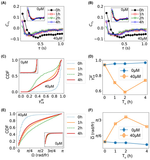 Characterization of bacterial movement and comparison between untreated and treated bacteria. (A,B) Autocorrelation of velocities (A: vx; B: vy) for bacteria treated with Ag+ ions at 40 µM for 0, 1, 2, and 4 h. Insets: the corresponding results for untreated bacteria. (C) Cumulative distribution function (C,D,F) of the maximum chord-to-arc ratio () for the trajectories of bacteria untreated (0 h) or treated with 40 M Ag+ ions for 1, 2, and 4 h. (D) Dependence of the mean of on treatment time. (E) CDF of the changing rate of swimming directions () for bacteria untreated (0 h) or treated with 40 M Ag+ ions for 1, 2, and 4 h. (F) Dependence of the mean of on treatment time.