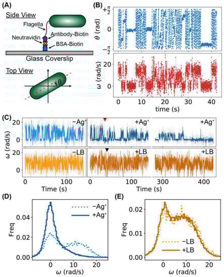 In the tethering assay experiments [43,44], E. coli bacteria in the mid-exponential phase (OD600 ≈ 0.3) were tethered to glass-bottom Petri dishes through their flagella. The tethering was achieved by coating the glass surface with biotinylated BSA, neutravidin, and biotinylated anti-FliC antibody sequentially [45,69]. E. coli flagella bind to the anti-FliC antibody [70,71], immobilizing the bacteria. The rotations of the tethered bacteria were monitored and recorded under phase-contrast microscopy with an exposure time of 5 ms for 10,000 frames without Ag+ ions (the actual time interval between adjacent frames was 14.1 ms). Then, Ag+ ions were directly added to the Petri dish at a final concentration of 40 µM, followed by recording the rotations of the same bacteria for 50,000 to 100,000 frames. For negative controls, the LB medium (instead of Ag+ ions) was added to the Petri dish and the rotations of the bacteria were recorded similarly. Experiment replications were performed independently on different days.