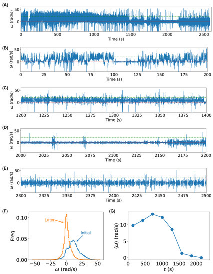 We observed that the magnitude of the angular velocity of the bacteria decreased after adding Ag+ ions (Figure 5). For example, the angular velocity of the bacterium in the running state was ~20 rad/s initially, while it decreased to ~10 rad/s after ~1000 s (Figure 5A–E). In addition, longer pauses were observed (Figure 5A–E), indicating that the flagellar motors indeed stopped intermittently without tethering. Furthermore, we examined the distribution of the angular velocity and found that the tumbling/pausing peak (lower ) became dominant during the latter half of the trajectory (Figure 5F). Such an observation was further confirmed by examining the running average of the angular velocity as a function of the treatment time (Figure 5G). These observations were consistent with those from the tethering assay, suggesting that the tethering assay could reliably measure the flagellar motor motion. On the other hand, we noted that, compared to the tethering assay, bacterial tumbling (i.e., rotation in the CW direction) was observed more frequently in the untethered rotation assay, implying that multiple flagellar filaments were attached in the antibody-based tethering assay.
