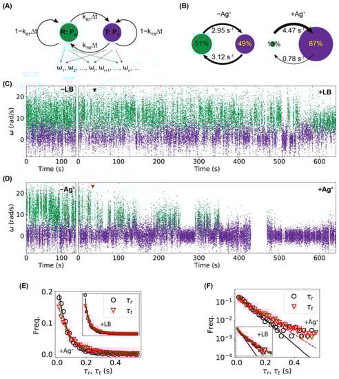 Hidden Markov model (HMM) analysis. (A) The hidden Markov model with two states (running (R) vs. tumbling/pausing (T)), which emit observations of angular velocities . The probabilities for the system to be in the running (green) and tumbling/pausing (purple) states are and , respectively. The transition probabilities between the two states are and , where and are the corresponding transition rates and is the time interval between observations. (B) Predicted parameters (, , , and ) from the HMM analysis for pre-Ag+ and post-Ag+ -trajectories of the bacterium in the top row of Figure 4C. (C,D) Predictions of states from the fitted/trained HMM model for the angular velocity () trajectories for (C) an untreated bacterium and (D) a Ag+-treated bacterium. Green and purple colors indicate the running and tumbling/pausing states, respectively. The red and black arrows indicate the time of adding Ag+ ions or LB medium, respectively. (E,F) Distributions of the dwell times ( for running dwell time and for tumbling/pausing dwell time) from the untreated (insets) and Ag-treated bacteria shown in panels (C) and (D) in (E) linear scale or (F) log-linear scale. Solid and dashed lines are fitted exponential curves.