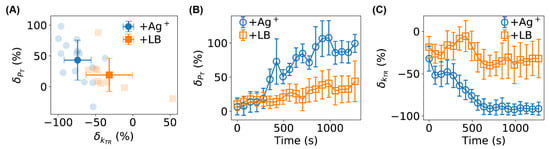 (A) Statistics of the relative changes in and for 10 untreated (orange squares) and 15 Ag+-treated bacteria (blue circles). Error bars stand for standard deviation. (B,C) Time dependencies of the relative changes in (B) and (C) for untreated (orange squares) and Ag+-treated (blue circles) bacteria. Error bars stand for the standard error of the mean.