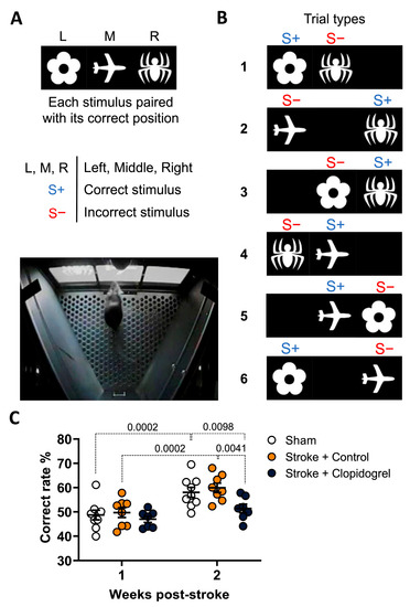 PAL task performance post-stroke. (A) A schematic depicting the stimuli used during the PAL task (flower, airplane, spider), which were only correct when displayed in the left (L), middle (M), or right (R) locations, respectively. (B) A schematic depicting six different types of trials (1–6) that occurred during the PAL task. Two different stimuli were presented in each trial: one was presented in its correct location (S+) while the other was presented in an incorrect location (S−). (C) The graph shows the percentages of correct responses of mice in each of the three groups (sham, stroke + control, stroke + clopidogrel) in the first and second weeks of treatment. Data were checked for normality using the Shapiro–Wilk normality test and then analyzed using two-way ANOVA with multiple comparisons (Benjamini, Krieger, and Yekutieli test). Data are given as the mean ± SEM. Significant p-values are indicated.