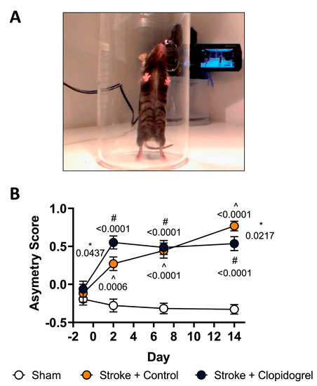 The effect of short-term clopidogrel administration on motor impairment. (A) Illustrates the placement of the mouse in the cylinder in which the spontaneous forelimb placement task was undertaken. (B) Cylinder task asymmetry scores for the three groups (sham, stroke + control, stroke + clopidogrel) at baseline (one day before stroke (/sham) surgery) and at 2, 7, and 14 days post-stroke. Data were checked for normality using the Shapiro–Wilk normality test and then analyzed using two-way ANOVA with multiple comparisons (Benjamini, Krieger, and Yekutieli test). Data are given as the mean ± SEM. Significant p-values are indicated. ^ denotes changes between the sham-operated and stroke + control animals, # denotes changes between the sham-operated and stroke + clopidogrel animals, and * denotes changes between the stroke + control and stroke + clopidogrel animals.