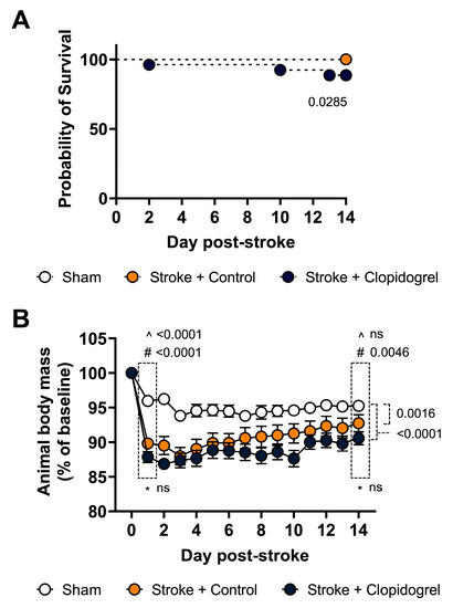 Each mouse’s body weight was recorded daily throughout the experiment. Overall, the body weight change was calculated as a percentage (%) change from baseline (day 0) to the last day of clopidogrel administration (day 14). Compared with the sham-operated mice, there was a significant decrease in body mass of both the stroke + control-treated mice (p = 0.0016) and stroke + clopidogrel-treated mice (p < 0.0001) across the 14 days, but there was no overall significant difference between the stroke + control-treated mice and stroke + clopidogrel-treated mice (p = 0.0591) across the 14 days. Looking at the results more closely, on day 1 post-stroke, we recorded a significantly larger decrease in body mass in both the stroke + control-treated mice (p < 0.0001) and stroke + clopidogrel-treated mice (p < 0.0001) than in the sham-operated mice; however, there was no significant difference in body mass between the stroke + control-treated and stroke + clopidogrel-treated mice (p = 0.0693). On day 14 post-stroke, there was no significant difference in body mass between the stroke + control-treated and sham-operated mice (p = 0.0895); however, the body mass of the stroke + clopidogrel-treated mice remained significantly decreased compared with the sham-operated mice (p = 0.0046) (Figure 3B).