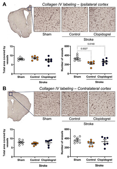 Collagen IV labeling was visualized to assess any changes in the vasculature in both the ipsilateral and contralateral cortexes. Within the ipsilateral cortex, there were no significant differences in the total area covered by collagen IV-labeled vessels between the three groups; however, the number of collagen IV-labeled vessels detected was significantly reduced in the stroke + control-treated mice (p = 0.0027) and stroke + clopidogrel-treated mice (p = 0.0140) compared with the sham-operated mice. There was no difference in the number of collagen IV-labeled vessels between the stroke + control-treated mice and stroke + clopidogrel-treated mice (Figure 4A).
