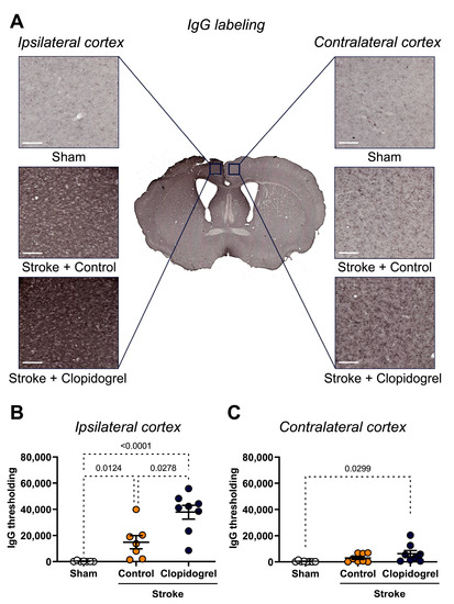 Within the contralateral cortex, there was no significant change in the IgG labeling between the sham-operated mice and stroke + control-treated mice (p = 0.1173), nor between the stroke + control-treated mice and stroke + clopidogrel-treated mice (p = 0.1566). However, the IgG labeling in the stroke + clopidogrel-treated mice was significantly elevated compared with the sham-operated mice (p = 0.0299) (Figure 5C).