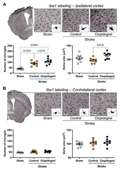 The effects of short-term clopidogrel treatment on the microglia number and morphology within the ipsilateral and contralateral cortexes. Iba1 labeling within (A) the ipsilateral cortex region and (B) the contralateral cortex region (scale bar = 60 µm). The top images show the regions examined and representative labeling observed for Iba1 for the three groups: sham, stroke + control, and stroke + clopidogrel. Microglia were reconstructed based on MicroTrac software detection of Iba1 labeling then, the microglia number and morphology were analyzed. The bar graphs underneath show the changes in the microglia number and soma area within the regions examined. All cells within one image were individually reconstructed and morphological parameters were averaged for each image, one per animal. Data were checked for normality using the Shapiro–Wilk normality test and then analyzed using two-way ANOVA with multiple comparisons (Benjamini, Krieger, and Yekutieli test). Data are given as the mean ± SEM. Significant p-values are indicated.