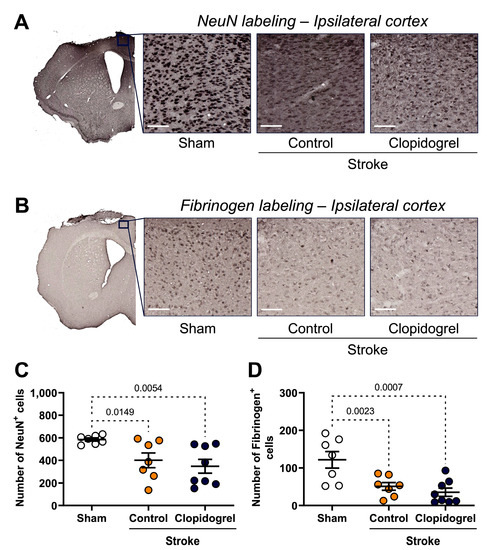 The effects of short-term clopidogrel treatment on neurons within the peri-infarct region. The location of the peri-infarct region examined and representative labeling of (A) NeuN-positive cells (scale bar = 65 µm) and (B) fibrinogen-positive cells (scale bar = 55 µm) for the three groups: sham, stroke + control, and stroke + clopidogrel. The bar graphs show the quantification of (C) the number of NeuN-positive cells and (D) the number of fibrinogen-positive cells. Data were checked for normality using the Shapiro–Wilk normality test and then analyzed using two-way ANOVA with multiple comparisons (Benjamini, Krieger, and Yekutieli test). Data are given as the mean ± SEM. Significant p-values are indicated.