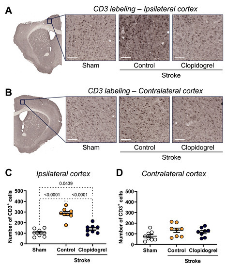 CD3 labeling, which is an established T cell marker, was visualized to assess the T cell number within the ipsilateral and contralateral cortex regions (Figure 8A,B). Compared with the sham-operated mice, the number of CD3-positive cells within the ipsilateral cortex region was significantly elevated in both the stroke + control-treated mice (p < 0.0001) and stroke + clopidogrel-treated mice (p = 0.0439) (Figure 8C). Additionally, the number of CD3-positive cells in the ipsilateral cortex of the stroke + control-treated mice was significantly elevated beyond that of the stroke + clopidogrel-treated mice (p < 0.0001).