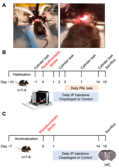 Experimental design timeline. (A) Photothrombotic occlusion set-up. (B) The first cohort of mice underwent motor impairment assessment using the cylinder task and memory and learning assessment using the PAL task. (C) The second cohort of mice was used for fixed tissue analysis (immunohistochemistry).