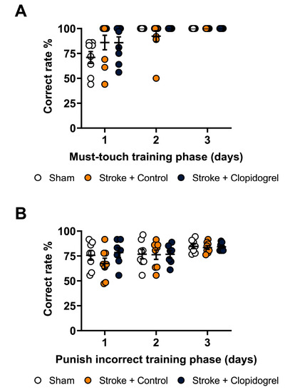 Mouse touchscreen operant chambers (Campden Instruments Ltd., Loughborough, Leics, UK) were used in the cognitive testing, as previously described [24,27,28,47,58]. Briefly, mice were calorie-restricted overnight before the cognitive testing. A strawberry milkshake was used as a reward to motivate the performance of the mice. Mice underwent touchscreen training (habituation) before the experiment commenced. First, mice were habituated to the testing chambers for 20 min with a strawberry milkshake placed in the food tray. The mice then underwent initial touch training, where they learned to associate the delivery of the strawberry milkshake with the illumination of the reward tray every 30 s, with strawberry milkshake collection (drinking) triggering the start of the next trial. Additionally, visual stimuli (white squares) were displayed in each of the three response windows of the touchscreen, with touch responses producing the delivery of the strawberry milkshake. Next, during the must-touch training phase, the mice were required to associate a nose poke with a white square stimulus randomly displayed in one of three response windows of the touchscreen with the delivery of the reward. Touch responses on the other two response windows of the touchscreen had no programmed consequences. The mice had to complete 36 trials in 60 min during this training phase to proceed to the final phase. In the punish-incorrect training phase, the mice learned that touching the screen with no stimulus led to punishment with a 5 s activation of a house light, the absence of a reward, and a low tone. The mice had to perform the punish-incorrect training phase with a minimum correct rate of 75% for the training to be considered successful. The results of the training are illustrated in Figure 10. Following the training, the mice underwent photothrombotic occlusion surgery (day 0). On day 3 post-stroke, the mice commenced the PAL task. In the task, three stimuli images (flower, airplane, and spider) were associated with a specific spatial location (left, middle, right). In each trial, two images were displayed at the same time, one in the correct location and the other in an incorrect location. All trials were mouse-initiated and independent of the experimenter. If the mouse touched the image in its correct location, a tone was triggered, a reward was provided, and a correct trial was recorded. After the reward collection, the next trial was initiated. If the mouse touched the incorrect image or the correct image in its incorrect location, it was punished by the absence of a reward, a low tone, a 5 s activation of a house light, and an incorrect trial was recorded. An incorrect trial was followed by a correction trial in which the same configuration of stimuli was presented again until a correct response was made. Correction trials were not counted toward the total number of trials completed nor were they included in accuracy calculations. Each PAL session lasted for a maximum of 60 min or until the mouse completed 36 trials (excluding correction trials).
