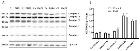 Mitochondrial dysfunction can result from a disruption of the OXPHOS chain, leading to abnormal energy and ROS production [,]. We first examined whether electromagnetic stress affects cardiac OXPHOS components in mice subjected to 915 MHz EMFs for 14 days. To detect the OXPHOS complexes simultaneously, the total proteins were extracted from cardiac tissue for immunoblotting using a total OXPHOS rodent antibody cocktail kit (Figure 1A). As shown in Figure 1B, the myocardial expression levels of mitochondrial OXPHOS complexes I to V were not significantly different between the control and EMF-exposed mice.