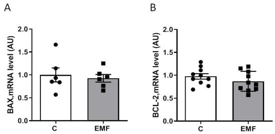 Next, we examined whether exposure to EMFs for 14 days induces cardiac tissue apoptosis in mice. Gene expression was assessed using quantitative polymerase chain reaction (qRT-PCR). Apoptotic gene expression was evaluated based on the BAX gene (BCL-2 Associated X-protein) and B-cell lymphoma 2 (BCL-2). Analysis of apoptosis-associated genes demonstrated that the myocardial expression levels of BAX (Figure 2A) and BCL-2 (Figure 2B) were not significantly different between the control and EMF-challenged groups.