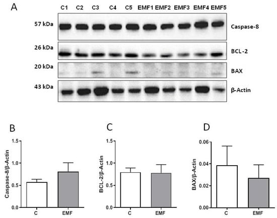 Furthermore, protein expression of apoptosis-related factors caspase-8, BAX, and BCL-2 was examined using Western blotting for the control and EMF-exposed mice. As shown in Figure 3A–D, the cardiac expression of caspase-8, BAX, and BCL-2 was stable among the control and EMF-challenged groups.