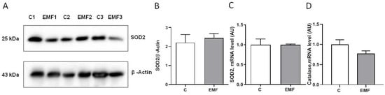 To examine antioxidant statuses of the EMF-challenged mice, we assessed the cardiac expression of SOD2, a key component of the mitochondrial antioxidant defense and catalase. As shown in Figure 4A–C, the SOD2 protein and mRNA expression levels were unchanged between the control and EMF-exposed mice. Catalase mRNA levels did not differ significantly in the hearts exposed to EMFs compared to control group (Figure 4D).