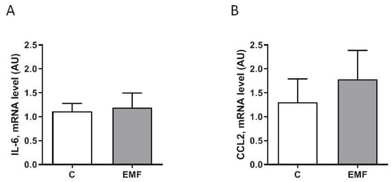 Exposure to electromagnetic stress can modulate inflammatory responses, signal transduction pathways, and downstream protein factors relevant to stressful signals [,]. As shown in Figure 5A,B, the myocardial expression of pro-inflammatory factors including interleukin-6 (IL-6) and C-C motif chemokine ligand 2 (CCL2) was not significantly different between the control and EMF-exposed groups.