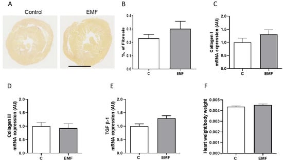 Alterations in inflammatory status are among the sensitive parameters that can be used to elucidate the cellular stress response to electromagnetic stress. The short- and long-term exposure to an EMF can compromise the integrity of the immune system as it can damage immune cells and irreversibly affect some immune functions []. In our experimental protocol, no significant changes in the structural integrity of the cardiac tissue of EMF-exposed mice were found. In addition, the results from the analysis of fibro-inflammatory cytokines including TGF β-1, IL-6, and CCL2 genes showed unchanged myocardial fibrotic and inflammatory statuses of the myocardium after exposure to an EMF for 14 days. Interestingly, a recent study suggested that a 900 MHz EMF can activate the brain and kidney renin–angiotensin system, and this activation may be related to inflammatory reactions []. In addition to cardiac inflammatory status, in the present study, we evaluated myocardial collagen content and the expression of fibrosis-related genes in the EMF-exposed mice. Importantly, in our experimental protocol, the total collagen content and gene expression of the predominant components of cardiac ECM collagen types I and III were comparable between the control and EMF-challenged hearts, suggesting that EMF exposure for 14 days does not induce fibrotic tissue remodeling. There is a lack of consistent results concerning the remodeling processes in cardiac tissue of human origin. Therefore, future studies should also address the integrative analysis of the biological effects of EMFs on different tissues and organs in humans.