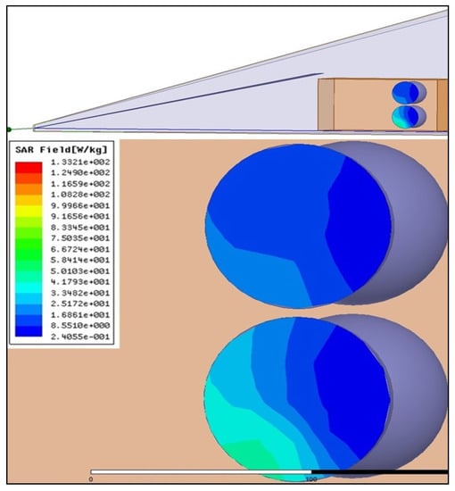 In vivo protocol was conducted using a Giga-TEM (GTEM) cell, in which the animals were subjected to EMF. The 915 MHz band was selected as the EMF level to which the mice would be exposed. It is a commonly used band in the Global System for Mobile Communications (GSM) and accounts for a large share of the total electromagnetic energy emitted to the environment by mobile systems. A solid-state radiofrequency generator with a fixed frequency of 915 MHz (WSPS-915–1000) (Chengdu Wattsine Electronics Technology, Chengdu, Sichuan, China) was used for the experiments. The interactions of EMF with animal models were defined in terms of specific absorption rate (SAR). In this study, the SAR was determined numerically and expressed in units of watts per kilogram (W/kg), as previously described []. Electromagnetic computations were performed using High Frequency Structure Simulator (HFSS) software, version 11.1. The GTEM was powered using 1 W of input power at 915 MHz. In this configuration, six phantoms were placed in two rows perpendicular to the GTEM axis (Figure 7). The variation of the SAR in the plane of symmetry shows that the maximum value approaches 50 W/kg, corresponding to 200 W/kg when a 4 W generator is used in real conditions. In a mouse model, the average value of the SAR calculated on the basis of the extracted data was ~40 W/kg.