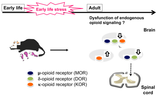 Previously, we reported that ELS model mice induced by maternal separation and social isolation (MSSI) showed emotional disorders such as depression-like behavior and anxiety-like behaviors, and chronic pain [41,42]. Pups in both groups (MSSI and control) were housed with dams until postnatal day 14. On postnatal day 15, the pups in the MSSI group were placed in individual isolation cages for 6 h per day away from their mothers. After a seven-day separation from their mothers, the pups were kept in isolation cages until they were 10 or 18 weeks old. These mice showed abnormal behavioral phenotypes, such as anxiety- and depression-like behaviors and altered social interactions [41]. We determined that MOR, DOR, and KOR mRNA expression decreased in the periaqueductal gray matter (PAG) of MSSI mice. In contrast, the expression of KOR mRNA was significantly increased in the amygdala of MSSI mice [19]. MSSI mice also demonstrated decreased morphine responsiveness over two months after the last ELS loading. Morphine modulates spinal nociceptive transmission by acting on opioid receptors in the supraspinal region and activating the endogenous descending pain inhibitory systems. The PAG is the primary site of action of opioid analgesics, such as morphine [43,44]. These results suggest that opioids in the central nervous system are strongly affected by ELS exposure, which attenuates the antinociceptive effects of morphine (Figure 1). Other studies have shown that the antinociceptive effects of morphine are reduced in mice subjected to other types of chronic stress, such as repetitive restraint stress or unpredictable chronic stress [45,46,47,48]. Therefore, ELS may significantly alter the responsiveness of opioid receptor agonists, such as morphine, resulting in altered pain sensitivity. Furthermore, the functional disruption of opioid signaling caused by ELS exposure may contribute to the development of psychiatric disorders and chronic pain.
