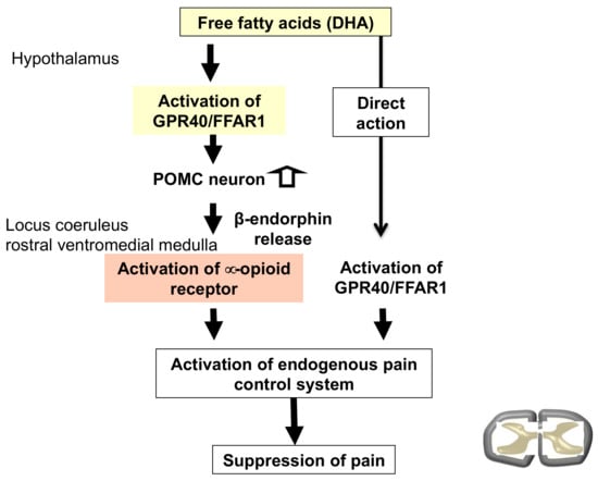 The possible mechanism for DHA-induced antinociception. Downward arrows indicate the flow of antinociceptive mechanisms of DHA. Our hypothesis is that DHA binds GPR40/FFAR1 and directly activates descending pain control mechanisms or indirectly activates these mechanisms via β-endorphin. White arrows represent POMC neuronal activation.