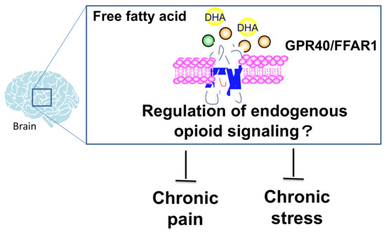 The brain fatty acid-GPR40/FFAR1 signaling may be suppressed to chronic pain and chronic stress via regulation of the endogenous pain control system. Colored circles represent long-chain fatty acids that act on GPR40/FFAR1. “Inverted T-shaped arrows” indicates that GPR40 signaling activation may suppress chronic pain and chronic stress through regulation of endogenous opioid signaling.