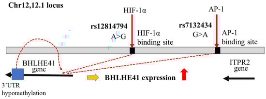 Genetic and epigenetic changes on chromosome 12 relating to BHLHE41/DEC2 expression in ccRCC development. BHLHE41/DEC2 expression via SNP rs7132434, rs12814794, and hypomethylation of BHLHE41/DEC2-3′UTR in ccRCC development. The red arrows indicate the transcription factors can bind around the SNPs. The red dashed lines show to induce expression of BHLHE41/DEC2 by these changes.