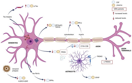 - Progranulin: it is a ubiquitous growth factor, which is important for tissue development, proliferation, and repair [159]; in particular, progranulin has been implicated in various brain mechanisms [203], including neurite outgrowth [204], stress response [205], TDP-43 aggregation [206], and synaptic function [207], although the evidence is not yet conclusive. It is reduced in the CSF of patients with bvFTD and svPPA (i.e., those with predominantly TDP-43 pathology) compared to those with nfvPPA (i.e., those with predominantly tau pathology) [159,208]. Importantly, patients with GRN mutations manifest reduced progranulin concentrations in both blood and CSF; thus, this index could be used to identify carriers of this mutation in the appropriate clinical context [209,210]. Moreover, the reduction in its levels is associated with complement activation in brain tissue, demonstrated by increases in complement fractions C1qa and C3B in the CSF during the disease course [211].