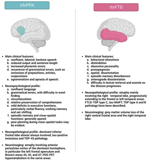 - rtvFTD: atrophy usually starts in the right temporal lobe and then spreads to either the frontal or left temporal areas [141]. The most common findings are FTLD-TDP type C, tau-MAPT, and TDP type A and B. On the other hand, svFTD, i.e., its left counterpart, is associated with the TDP type C pathology [137,141,142]. Furthermore, associations with FUS [79] and TDP-E have very rarely been described [141,143]. Interestingly, this pathology is often associated with MND [144].