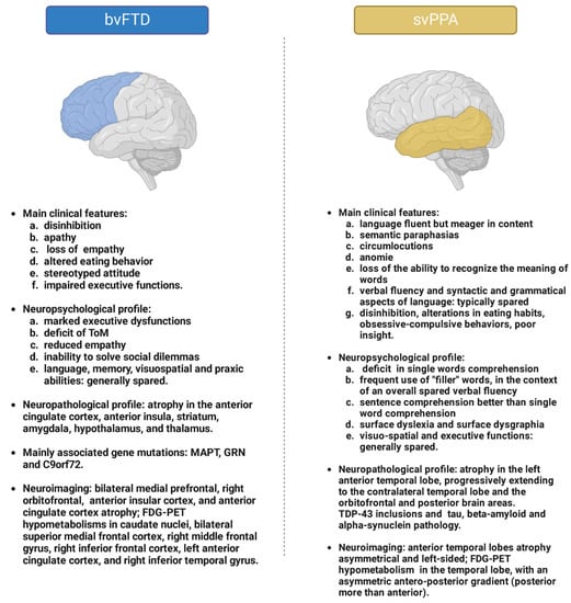 SvPPA is characterised by a mean age of onset around 60 years and slower progression than bvFTD [35]. In this disorder, cortical atrophy at onset is typically asymmetrical, primarily affecting the left or right anterior temporal lobe, and with only subsequent and progressive extension to contralateral homologous regions and the ipsilateral orbitofrontal cortex. This progression occurs slowly over about three years, and most patients have left anterior temporal lobe involvement in the early stages (around 70% of patients) [36]. In the latter case, the pivotal clinical element is represented by an alteration in language, which appears fluent but meagre in content, full of semantic paraphasias, circumlocutions, and anomie. The patient therefore manifests a loss of the ability to recognise the meaning of words, at first in a sectorial manner for less commonly used ones, and then progressively for more frequently used terms as well. In contrast, verbal fluency and syntactic and grammatical aspects of language are typically spared [37]. In the case of the main involvement of the right anterior temporal lobe, on the other hand, the appearance of behavioural alterations can be observed, similarly to bvFTD, with disinhibition, alterations in eating habits, appearance of obsessive–compulsive behaviours, and poor insight. Patients generally show emotional detachment, easy irritability, tendency to social isolation, and alterations in sleep, appetite, and libido [38]. Also in this case, as already observed for bvFTD, a ToM deficit and a difficulty in reading others’ emotions can be found, caused by dysfunction of the right amygdale [17]. In the case of both left and right lobe involvement, it is also possible to observe the development of new distinct interests, particularly in artistic skills, such as drawing, painting, or music [39].