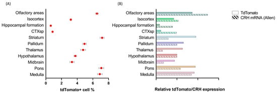 Overview of tdTomato marker expression in the brain of Crh-IRES-Cre;Ai9 mice. (A). Density of tdTomato positive cells in major brain areas expressed as number of tdTomato positive cells/number of DAPI positive cells × 100. (B). Comparison of tdTomato and CRH mRNA expression (as reported in Allen Brain Atlas). Both markers have been normalized to the hypothalamic values.