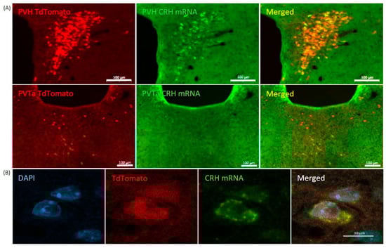 - Wamsteeker Cusulin, J.I.; Fuzesi, T.; Watts, A.G.; Bains, J.S. Characterization of corticotropin-releasing hormone neurons in the paraventricular nucleus of the hypothalamus of Crh-IRES-Cre mutant mice. PLoS ONE 2013, 8, e64943. [Google Scholar] [CrossRef] [PubMed]