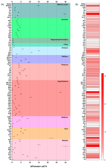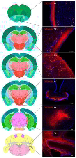 2.2. Distribution of tdTomato Positive Neurons in the Mouse Brain