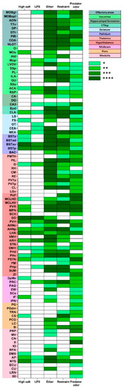 In addition to the core system, stressor-specific regions have also been revealed. For instance, contribution of olfactory areas was evident in ether and predator odor exposed animals, which were not activated at all in hypertonic salt or LPS-injected animals. By contrast, magnocelluar neurosecretory cells in the supraoptic nucleus displayed significant FOS staining in response to systemic challenges but not to psychological insults. Comparison of FOS patterns in the mouse brain responding to systemic vs. neurogenic stimuli revealed them as highly distinct with more widespread neuronal activation seen after neurogenic stressors. Such differential activation by interleukin-1 (systemic) vs. foot shock (neurogenic) stressors has been described in case of rats [53].