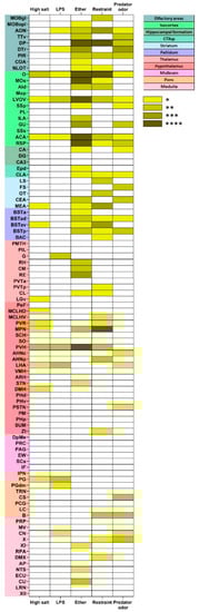 Placing animals into a novel environment (control for the predator odor exposure) resulted in moderate expression of FOS in all olfactory-related areas, increased FOS intensity in the prelimbic and infralimbic cortices, anterior cingulate area, lateral septum, PVH, ventromedial hypothalamic nucleus, posterior hypothalamic area, thalamic stress-responsive complex, periaqueductal gray and locus coeruleus. Supplementary Figure S3 indicates those areas where the difference is significant.