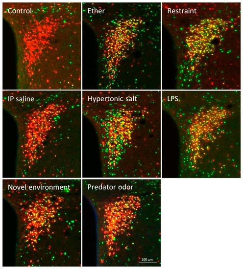 - Li, H.Y.; Ericsson, A.; Sawchenko, P.E. Distinct mechanisms underlie activation of hypothalamic neurosecretory neurons and their medullary catecholaminergic afferents in categorically different stress paradigms. Proc. Natl. Acad. Sci. USA 1996, 93, 2359–2364. [Google Scholar] [CrossRef] [PubMed]