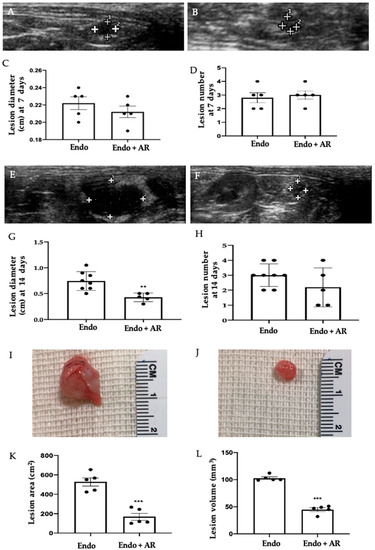 AR administration reduced the growth of endometriotic lesions: Abdominal high-frequency ultrasound (hUS) analysis seven days after the endometriosis induction: Endo (A), Endo + AR (B), lesion diameter (C), lesion number (D); hUS analysis fourteen days after the endometriosis induction: Endo (E), Endo + AR (F), lesion diameter (G), lesion number (H); macroscopic analysis: Endo (I), Endo + AR (J), lesion area (K), lesion volume (L). The Kolmogorov–Smirnov test was applied to verify the normal distribution of the data, and then the t-test was applied. A p-value of less than 0.05 was considered significant. ** p < 0.01 vs. Endo; *** p < 0.001 vs. Endo.