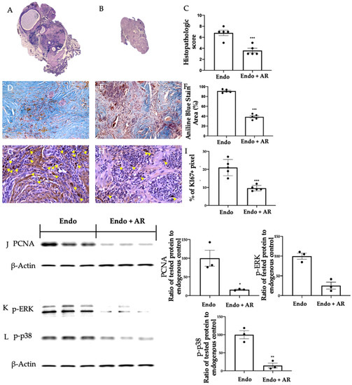 AR administration on lesion morphology, fibrosis, and cellular hyperproliferation: Histological analysis: Endo (A), Endo + AR (B), histopathologic score (C); Masson’s trichrome staining (magnification 20×): Endo (D), Endo + AR (E), aniline blue stain area (F); immunohistochemical analysis of Ki-67 expression (magnification 40×): Endo (G), Endo + AR (H), graphical quantification of Ki-67 expression (I); Western blot analysis of PCNA (J), p-ERK (K), p-p38 (L). The Kolmogorov–Smirnov test was applied to verify the normal distribution of the data, and then the t-test was applied. A p-value of less than 0.05 was considered significant. * p < 0.05 vs. Endo; ** p < 0.01 vs. Endo; *** p < 0.001 vs. Endo.