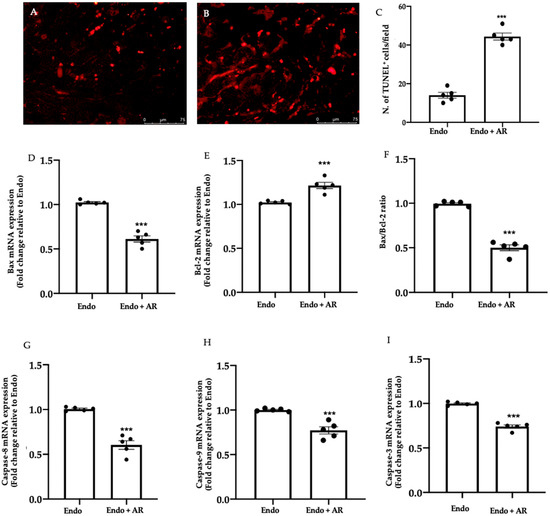 AR administration restored the apoptosis pathway: TUNEL assay: Endo (A), Endo + AR (B), number of TUNEL+ cells (C); RT-PCR analysis: Bax (D), Bcl-2 (E) mRNA levels, Bax/Bcl-2 ratio (F), Caspase-8 (G), Caspase-9 (H), and Caspase-3 (I) mRNA levels. The Kolmogorov–Smirnov test was applied to verify the normal distribution of the data, and then the t-test was applied. A p-value of less than 0.05 was considered significant. *** p < 0.001 vs. Endo.