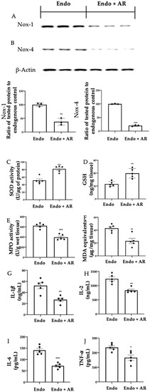 AR administration reduced the oxidative and pro-inflammatory environment. Western blot analysis of Nox-1 (A) and Nox-4 (B); SOD activity (C); GSH levels (D); MPO activity (E); MDA (F), IL-1β (G), IL-2 (H), IL-6 (I), and TNF-α (J) levels. The Kolmogorov–Smirnov test was applied to verify the normal distribution of the data, and then the t-test was applied. A p-value of less than 0.05 was considered significant. * p < 0.05 vs. Endo; ** p < 0.01 vs. Endo; *** p < 0.001 vs. Endo.