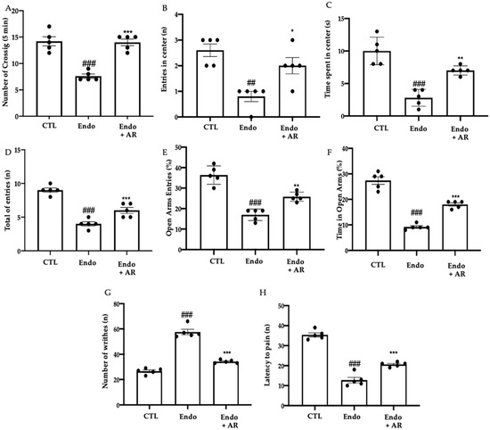 AR administration restored exploratory behavior and locomotor activity, as compared to the Endo rats (Figure 5A, CTL (14.2 ± 0.86), Endo group (7.6 ± 0.4), Endo + AR group (14 ± 0.63), p < 0.0001 vs. CTL, p < 0.0001 vs. Endo; Figure 5B, CTL (2.6 ± 0.24), Endo group (0.8 ± 0.45), Endo + AR group (2 ± 0.32), p = 0.001 vs. CTL, p = 0.0195 vs. Endo; and Figure 5C, CTL (10 ± 0.95), Endo group (2.8 ± 0.58), Endo + AR group (7 ± 0.32), p < 0.0001 vs. CTL, p = 0.0024 vs. Endo). Additionally, in the elevated plus maze test, the Endo + AR group rats showed a reduced number of entries in closed and open arms (Figure 5D, CTL (9 ± 0.32), Endo group (4 ± 0.32), Endo + AR group (6 ± 0.45), p < 0.0001 vs. CTL, p = 0.0066 vs. Endo), % of open entries (Figure 5E, CTL (36.4 ± 2.01), Endo group (17 ± 1.26), Endo + AR group (25,8 ± 1.02), p < 0.0001 vs. CTL, p = 0.0039 vs. Endo) and the % of time in open arms (Figure 5F, CTL (27.4 ± 1.47), Endo group (9.2 ± 0.49), Endo + AR group (18 ± 0.63), p < 0.0001 vs. CTL, p < 0.0001 vs. Endo), as compared to the Endo group. Endometriosis increased sensitivity to the acetic-acid-induced abdominal contractions (Figure 5G, CTL (26.6 ± 1.03), Endo group (57.6 ± 2.16), Endo + AR group (34.2 ± 0.58), p < 0.0001 vs. CTL, p < 0.0001 vs. Endo) and to thermal stimuli (Figure 5H, CTL (35.4 ± 1.03), Endo group (12.8 ± 1.39), Endo + AR group (20.6 ± 0.51), p < 0.0001 vs. CTL, p = 0.0006 vs. Endo), which were significantly reduced by AR administration.