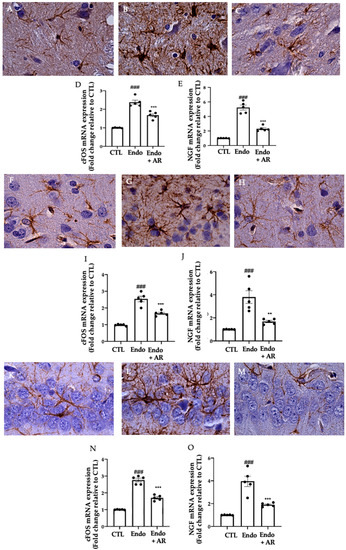 Immunohistochemical analysis was performed to evaluate GFAP expression. Increased GFAP expression was found in the spinal cord (Figure 6B), cortex (Figure 6G), and hippocampus (Figure 6L) of the Endo group, as compared to the control (Figure 6A,F,K). AR administration reduced GFAP immunoreactivity in all tissue examined (Figure 6C,H,M), as compared to the Endo group. RT-PCR showed increased mRNA levels of c-FOS and NGF in the spinal cord (Figure 6D, CTL (1 ± 0.01), Endo group (2.38 ± 0.11), Endo + AR group (1.68 ± 0.09), p < 0.0001 vs. CTL, p = 0.0001 vs. Endo; and Figure 6E, CTL (1 ± 0.01), Endo group (5.22 ± 0.35), Endo + AR group (2.30 ± 0.16), p < 0.0001 vs. CTL, p < 0.0001 vs. Endo, respectively), cortex (Figure 6I, CTL (1 ± 0.02), Endo group (2.54 ± 0.17), Endo + AR group (1.68 ± 0.07), p < 0.0001 vs. CTL, p = 0.0002 vs. Endo; and Figure 6J CTL (1 ± 0.01), Endo group (3.8 ± 0.55), Endo + AR group (1.68 ± 0.1), p = 0.0002 vs. CTL, p = 0.0016 vs. Endo, respectively) and hippocampus (Figure 6N, CTL (1 ± 0.01), Endo group (2.76 ± 0.11), Endo + AR group (1.7 ± 0.07), p < 0.0001 vs. CTL, p = 0.0004 vs. Endo; and Figure 6O, CTL (1 ± 0.01), Endo group (3.96 ± 0.46), Endo + AR group (1.9 ± 0.07), p < 0.0001 vs. CTL, p = 0.0004 vs. Endo, respectively) of the Endo group, as compared to control. Endo + AR group showed reduced c-FOS and NGF mRNA levels in all tissue examined, as compared to the Endo group.