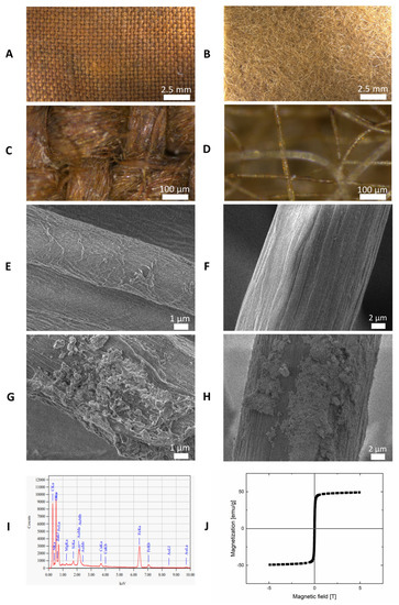 The prepared textile materials were additionally characterized to reveal their structure and magnetic properties. The digital optical microscope (Z16 APO, Leica Microsystems Co., Wetzlar, Germany) was used to provide information on the appearance of the textiles after functionalization with magnetic fluids. The morphology and structure of pure (native, non-magnetic) and magnetically modified woven and nonwoven textile materials were studied by scanning electron microscopy (SEM). Samples were analyzed using a Hitachi SU6600 scanning electron microscope (Hitachi Inc., Tokyo, Japan) with accelerating voltages of 1.0 or 1.5 kV. Using the same equipment, energy-dispersive X-ray spectroscopy (EDS) measurements were performed to investigate the content of the samples. A vibrational sample magnetometer (VSM) installed on a superconducting magnet (Cryogenic Ltd., London, UK) measured the magnetization curve at 295 K. Results are presented in Figure 2.