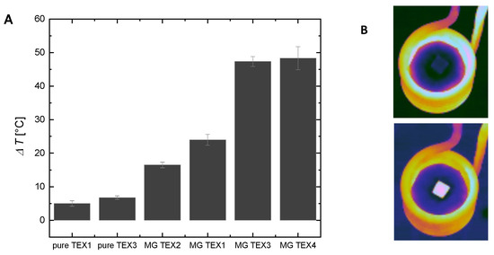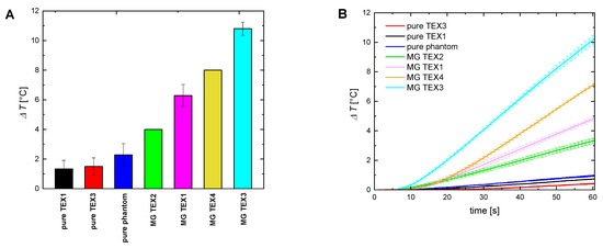 The tendency of temperature increase is similar to optical probe measurements (Figure 3B). The highest temperature increase was obtained with the magnetic acrylic felt MG TEX 3 and MG TEX 4 and smaller increases were obtained with the magnetic textiles MG TEX1 and MG TEX2. It is worth remembering that the temperature values obtained with IR thermometry and optical probes are slightly different as they show temperature rises in different places. The IR thermometer shows the temperature of the top surface of the agar phantom, and the optical probe shows the temperature inside a phantom.
