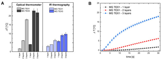 Secondly, we performed magnetic hyperthermia experiments on the agar tissue-mimicking phantoms covered with multiple layers of textile. Temperature rise was recorded with the optical sensor centrally placed inside the phantom and the IR camera. Here the experiment lasted 30 s (instead of 60 s) due to rapid temperature increases. Figure 4A compares the final temperature rise recorded with an optical fiber and IR camera, for the 30 s of measurement for various numbers of textile layers of MG TEX1 and MG TEX3. Figure 4B presents detailed temperature increase as a function of time for the cotton-based magnetic textile MG TEX1. Based on Figure 4A, one can see that regardless of the method of temperature registration, three layers of cotton-based magnetic textile MG TEX1 gave the highest temperature increase in tissue-mimicking material, compared to two MG TEX1 layers or one MG TEX1 textile layer. Covering the tissue-mimicking phantom with three layers or two layers of MG TEX3 also gave a higher temperature increase compared to only one MG TEX3 layer. Interestingly, we did not observe here a significant difference between three and two textile layers. We assume that the lack of significant difference between two and three layers of acrylic felt MG TEX3 comes from the textile thickness (2 mm) preventing efficient heat transfer between textile layers. The phantom covered with one layer of MG TEX3 had a diameter of 14 mm, that with two layers had a diameter of18 mm, and that with three layers had a diameter of 22 mm compared to the diameter of 13 mm, 12 mm, and 11 mm for a phantom covered with three layers, two layers, and one layer of MG TEX1, respectively.