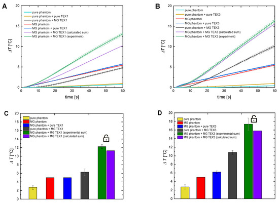 Comparison of the temperature elevation in the pure tissue-mimicking phantoms and the tissue-mimicking phantoms doped with nanoparticles for cotton-based TEX 1 (A) and acrylic felt textile TEX3 (B) for optical fiber, and (C,D) for the IR camera. The symbol of a locker symbolizes the unlocking of the Brownian relaxation mechanism. The magnetic field intensity was 16.2 kA/m, and the frequency was 356 kHz.