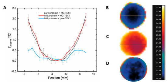 Comparison of spatial temperature distribution along a chosen cross-section in pure tissue-mimicking phantom covered with magnetic textile (MG TEX1), magnetic phantom covered with pure textile (TEX1), and magnetic phantom covered with magnetic textile (MG TEX1). (A) Relative temperature increase vs. position of pixels along the phantom’s diameter. The IR images of pure tissue-mimicking phantom covered with MG TEX1 (B), magnetic phantom covered with MG TEX1 (C), and magnetic phantom covered with pure woven TEX1 (D). The magnetic field intensity was 16.2 kA/m, and the frequency 356 kHz. The temperature values were obtained from the IR images for the last second of measurement (60th second). The IR images were taken from the top view of the phantom.