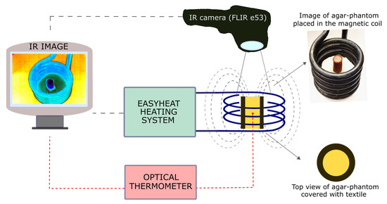 To investigate the heating abilities of magnetic textiles, small pieces of textiles (1 × 1 cm) were placed inside the geometrical center of a heating coil. The temperature sensor FLUOTEMP provided by Photon Control Inc., Burnaby, BC, Canada, equipped with optic fiber (FTP-NY2) was placed below the material to record the temperature increase generated by the textile. To measure the temperature change inside the tissue-mimicking samples, we placed the same temperature sensor FLUOTEMP in the middle of the agar phantom. To investigate the temperature distribution of the phantom, depending on the radial distance from the heating textile to the sample center, we used an infrared (IR) camera (FLIR e53, FLIR Co., Wilsonville, OR, USA). The thermographic measurements are based on a so-called radiometric equation. The camera measures the radiance emitted by a tested object after considering the influence of radiance of the surrounding medium [29]. The IR camera was placed at a safe distance from the coil to ensure no interference between the camera sensor and the magnetic field. The scheme of the experiments is presented in Figure 7. The results from the IR camera were analyzed with the FLIR Research Studio version 2.1.0. Each experimental point presented in Figure 2, Figure 3, Figure 4, Figure 5, Figure 6 and Figure S2 was calculated based on the data obtained from several measurements and is shown with a standard deviation.