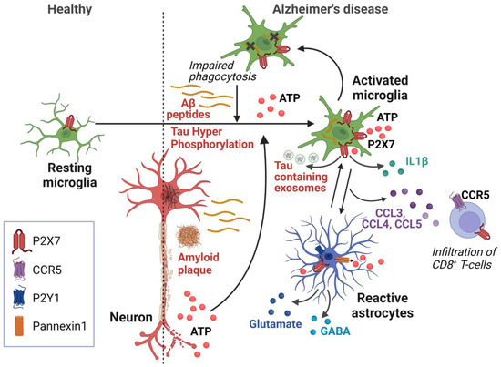 Schematic representation of P2X7-dependent mechanisms involved in Alzheimer’s disease. In this model, increased levels of Aβ peptide induce ATP release from microglia and astrocytes, as well as from damaged neurons. This ATP release is amplified by astrocytes via purinergic receptors and ATP release via Pannexin 1. P2X7 on microglia and astrocytes senses high ATP levels and initiates neurodegenerative processes via the production of IL-1β and CCL3, CCL4, and CCL5 chemokines, leading to impaired neuronal function and the recruitment of pathogenic CD8+ T lymphocytes. Activation of P2X7 also induces the secretion of Tau-containing exosomes from microglia, contributing to Tau pathology. The presence of high amount of ATP inhibits P2X7-mediated phagocytosis, further increasing the accumulation of Aβ peptides. Created with BioRender.com.